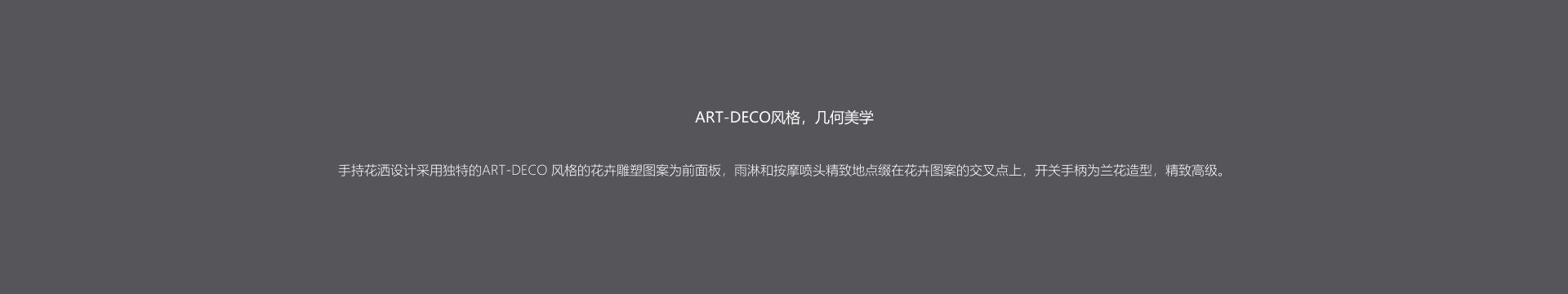 采用PVD镀层,日本拉丝金表面工艺,手持喷头设计成独特的Art-deco 风格花卉图案,雨淋和按摩喷头点缀在花卉图案交叉点上,享受无与伦比的淋浴体验。
